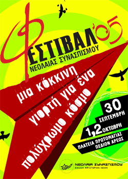 ΦΕΣΤΙΒΑΛ ’05 ΝΕΟΛΑΙΑΣ ΣΥΝΑΣΠΙΣΜΟΥ: Μια Κόκκινη Γιορτή, Για Ένα Πολύχρωμο Κόσμο!Το «Φεστιβάλ ’05» της Νεολαίας Συνασπισμού κορυφώνεται και φέτος με το καθιερωμένο τριήμερο-τελικό σταθμό στην Αθήνα. Στις 30 Σεπτεμβρίου και 1-2 Οκτωβρίου η γνωστή πια Πλατεία Πρωτομαγιάς (Πεδίον του Άρεως) θα γεμίσει από χρώμα, ιδέες και μουσικές του κόσμου. Θα συναντηθούμε ξανά, να συζητήσουμε, να ανταλλάξουμε εμπειρίες και εικόνες, να τραγουδήσουμε και να χορέψουμε, προσθέτοντας κόκκινες πινελιές στον αγώνα και την αναζήτηση ενός πολύχρωμου κόσμου. |